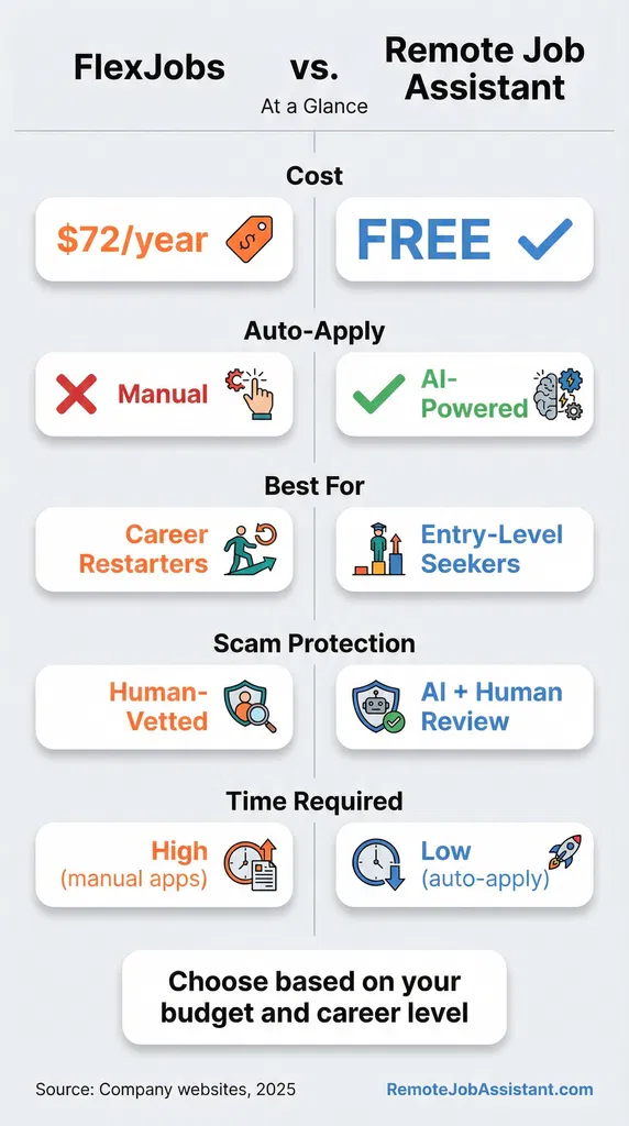 Remote Job Assistant wins for most moms. It's 100% free, includes AI auto-apply to save time, and focuses on the entry-level, flexible positions moms actually need. FlexJobs costs $24-72/year and requires manual applications, but offers career coaching and a broader job database. If you're re-entering the workforce after years away and need hand-holding, FlexJobs may justify the cost. If you want to start applying today without paying, use Remote Job Assistant.