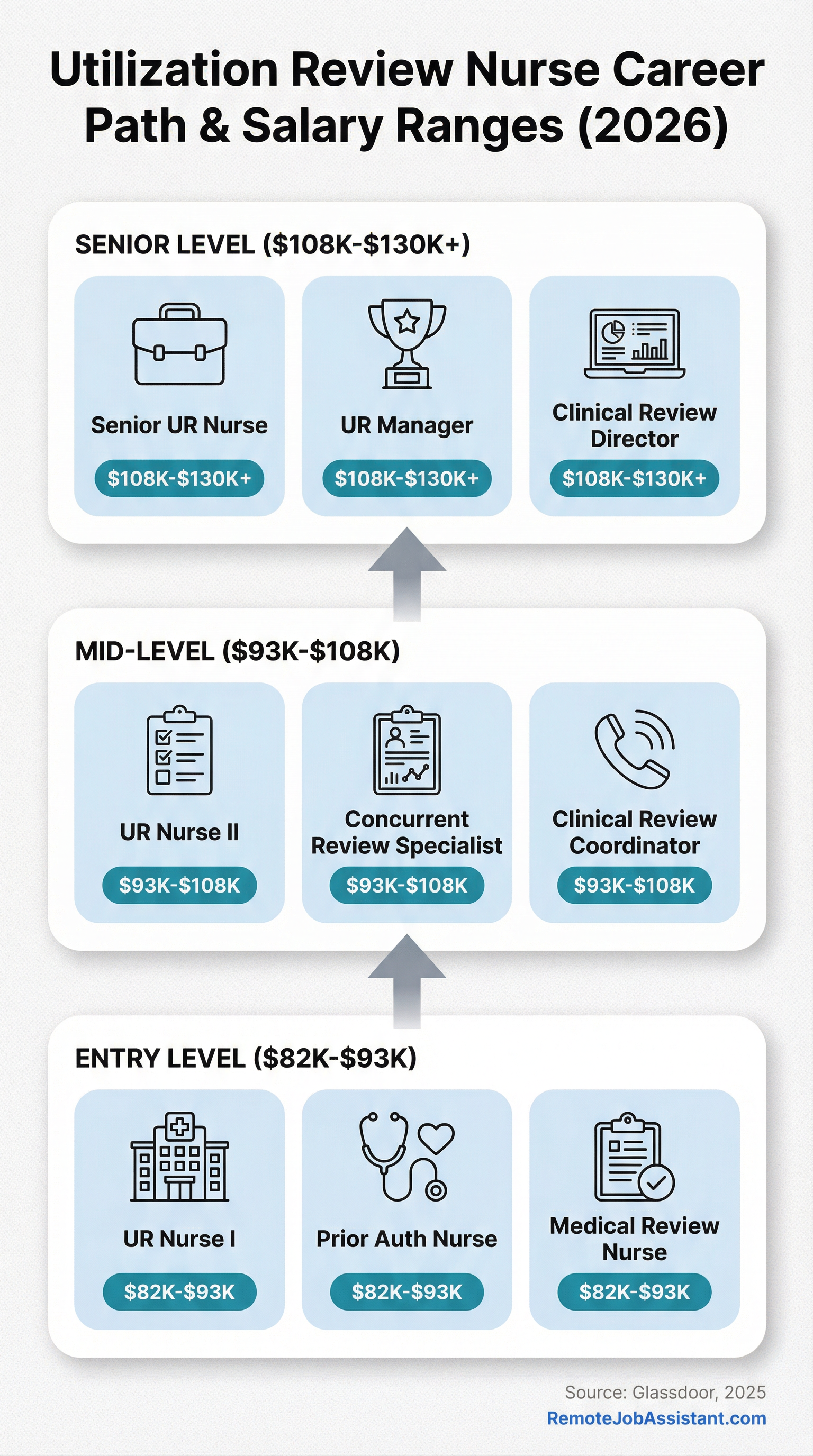 Remote UR nurses typically earn in the low-$80Ks to low-$100Ks annually based on 2025 Glassdoor data. Entry-level positions generally start around $82,000, while experienced nurses at top-paying employers can reach $120,000 or more. Salary varies by location, employer, and years of experience.